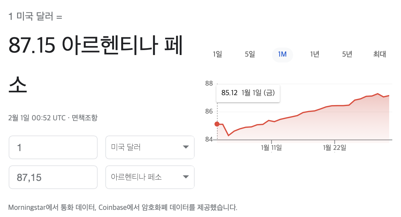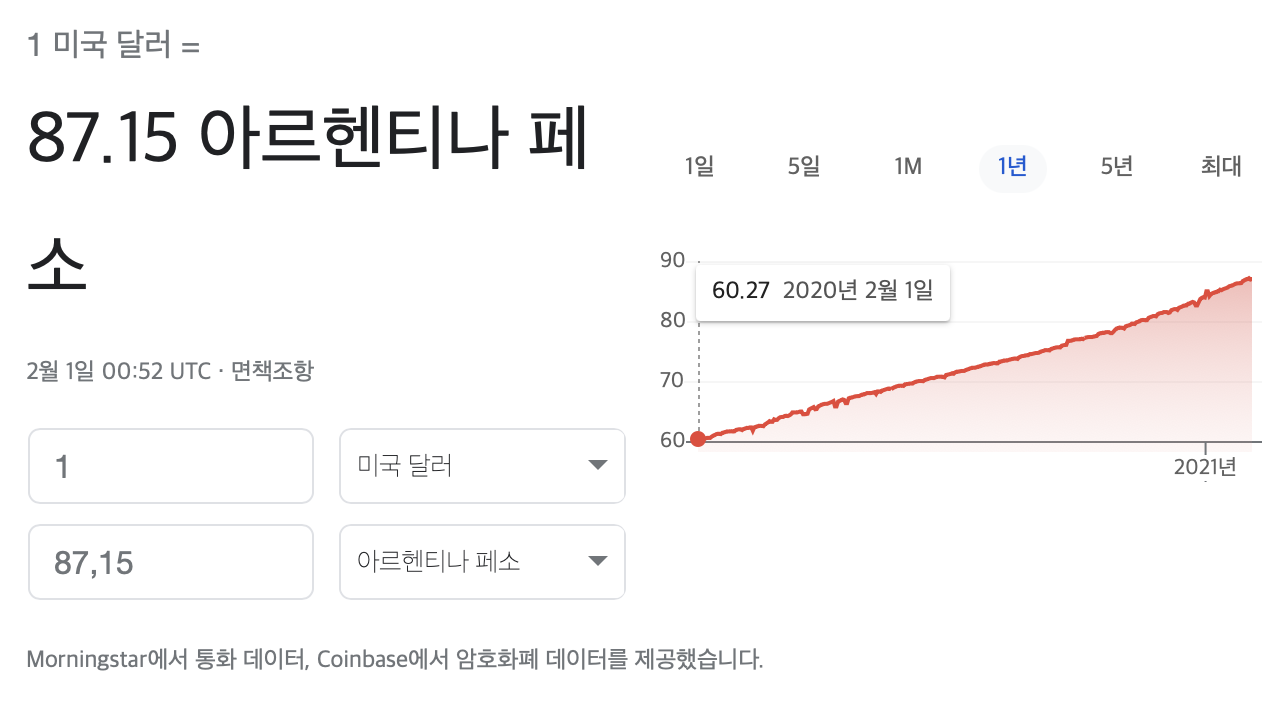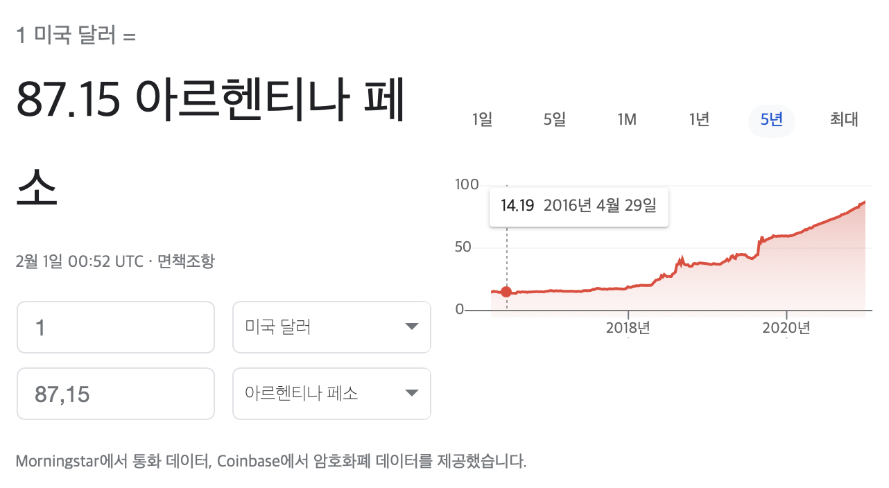 시계를 조금 더 멀리해서 보면 2016년 1달러에 14.19페소였던 시절도 있었다. 그래도 나름대로 체질개선을 위해 우파 대통령이 당선되었던 시기였는데 불과 몇년만에 다시 복지 확대하라고 사회주의 대통령에게 투표를 한 아르헨티나 사람들이 그 죄 달게 받고 있는 중이다.