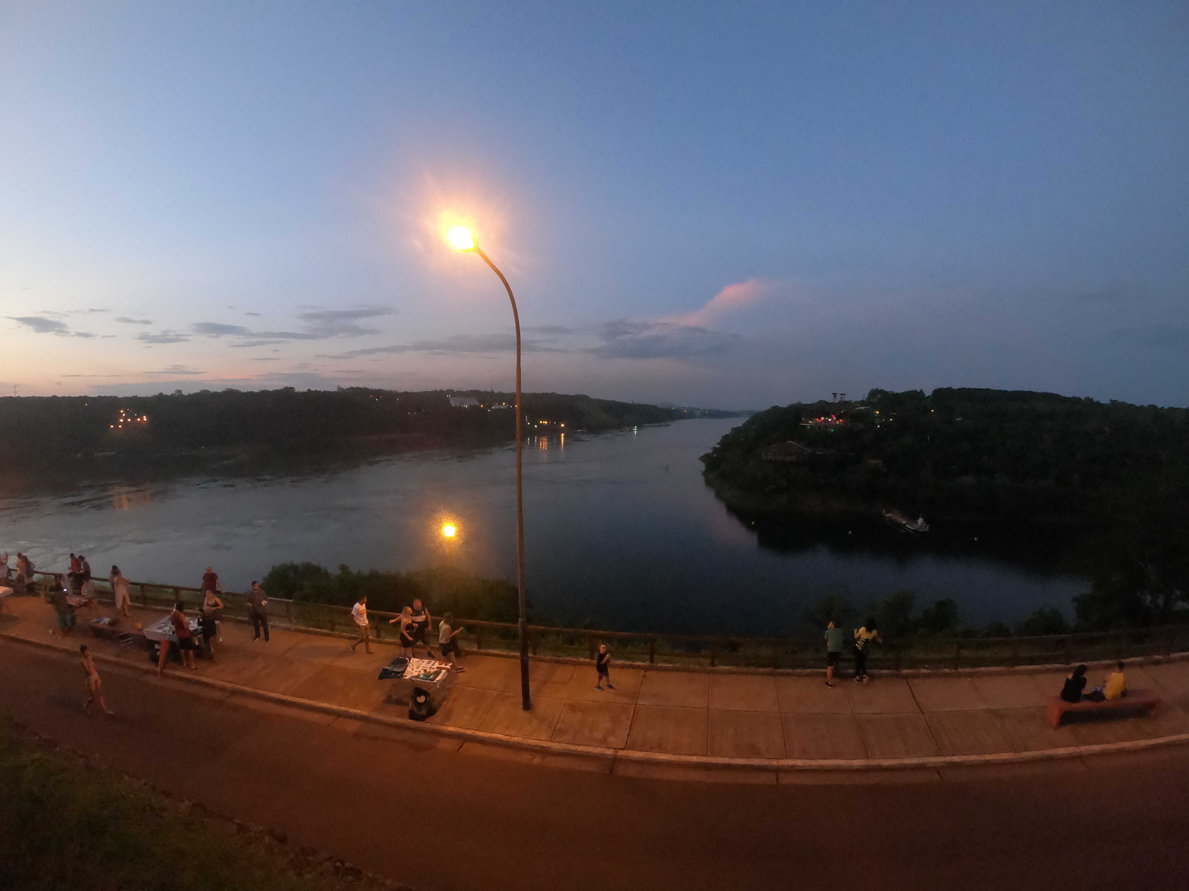 기념품가게와 노점으로 기념품을 판매하는 상인들도 많이 나와 있어서 심심하지 않게 3국 국경에서 야경을 보면서 시간을 보내기에 좋다. 사진에서 오른쪽 강 건너가 브라질, 왼편이 파라과이다. 파라과이쪽은 모르겠는데 브라질도 국경 지대에 아르헨티나 처럼 전망대가 있어서 사람들이 많이 보였다. 파라과이는 일전에도 언급했지만, 원래 이과수 지역이 이들의 땅이었다가 아르헨-브라질-우루과이 삼국동맹과의 전쟁에서 패하면서 빼앗기게 되었는데 지금 세계에서 가장 아름답고 웅장한 이과수를 빼앗긴게 얼마나 원통하고 분할지 상상도 안된다. 지금 당장 파라과이가 이들과 국력에서 비교가 안되는 수준으로 발전이 더딘 상황이라 사이가 나쁘지는 않다고 하는데 실제로 속마음은 어떤지 모르겠다. 파라과이는 지금도 남자가 한참 많이 모자라기 때문에 영주권을 받기도 매우 쉬운 나라 중 하나이다.