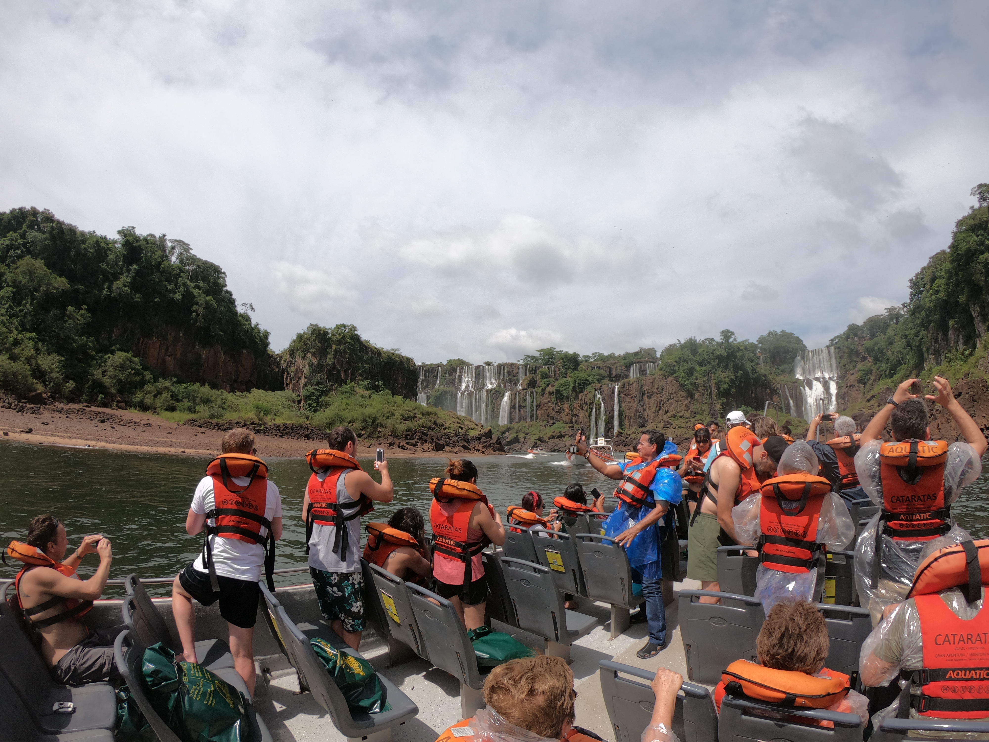 이과수 국립공원 입구에 우비를 파는 곳이 있는데 보트 투어한다고 우비만 입으면 되겠지 하면 낭패다. 우비는 소용이 없다. 저 사람들은 그냥 쌩 돈을 날린거다. 근데 저렇게 호기를 부리는 중년이상의 남성분들이 꼭 있다. 아까운 페소를 날린거다. 그리고 보트에는 보트투어 가이드가 같이 타는데 고프로로 영상을 찍어준다. 그리고 내릴 때 돈을 내면 찍은 영상을 보내주는데 비싼 가격은 아니었지만 돈을 내고 아직도 영상을 못 받았다. 보트 투어 가격은 1인당 아르헨티나 페소로 3000페소다. 당시 1달러에 60페소로 암환전을 했었기 때문에 50달러 정도다. 아르헨티나 물가를 생각하면 비싸고 한국인 입장에서는 별로 비싸지 않다.
