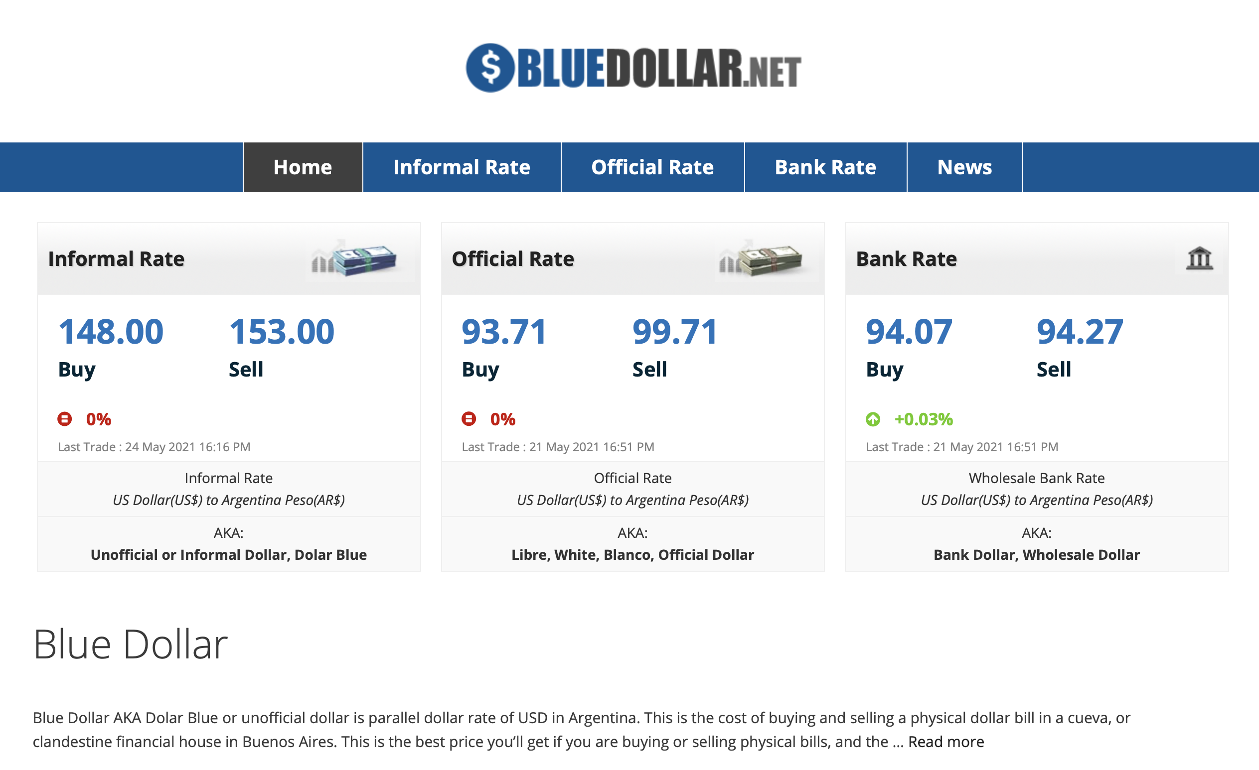Blue Dolar is unofficial Dollar Rate in Argentina. Get all information on the Blue Dollar such as Quotes, Charts, News. All types of Informal Rate, Formal Rate & Bank Rate of US Dollar in Argentina