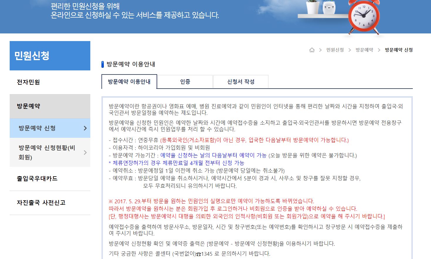 방문예약 이용안내 방문예약이란 항공권이나 영화표 예매, 병원 진료예약과 같이 민원인이 인터넷을 통해 편리한 날짜와 시간을 지정하여 출입국·외국인관서 방문일정을 예약하는 제도입니다