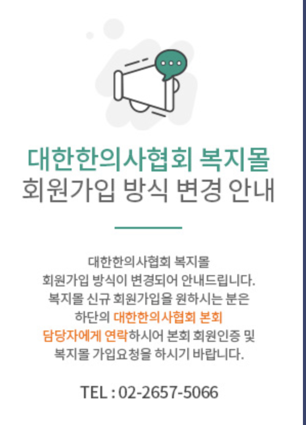 대한한의사협회 복지몰 회원가입 방식이 변경되어 안대드립니다. 복지몰 신규 회원가입을 원하시는 분은 하단의 대한 한의사협회 본회 담당자에게 연락하시어 본회 회원인증 및 복지몰 가입요청을 하시기 바랍니다.
