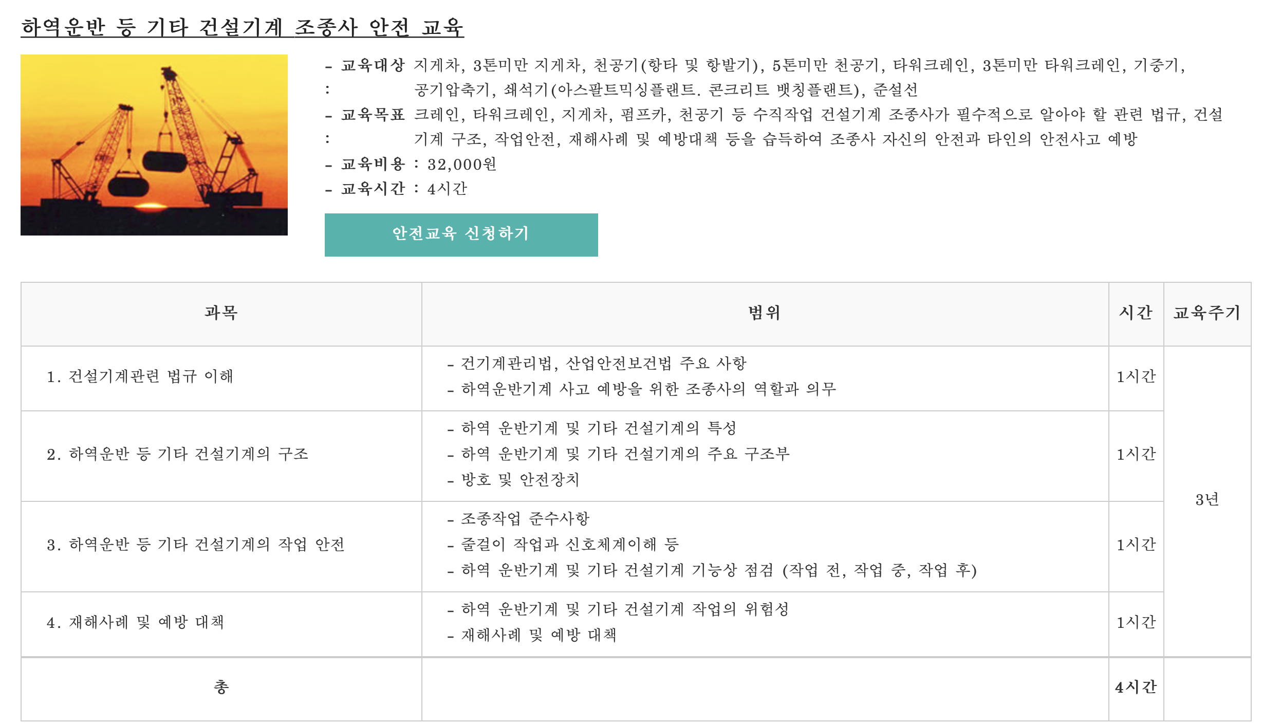 교육 대상 : 지게차, 천공기(항타 및 항발기), 5톤미만 천공기, 타워크레인, 기중기, 공기압축기, 쇄석기 (아스팔트믹싱플랜트, 콘트리트 뱃칭플랜트), 준설선