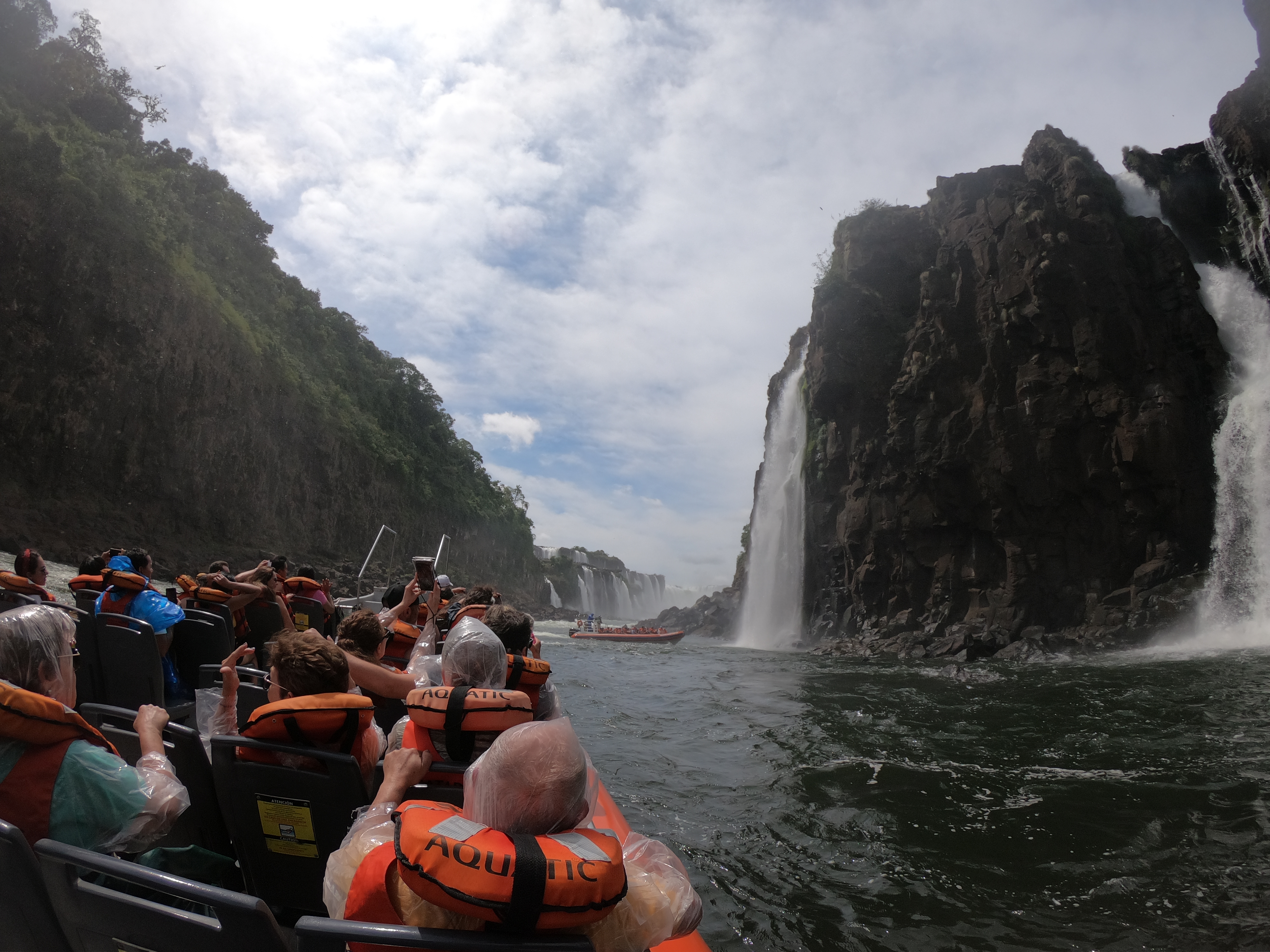 보트가 1차 폭포물줄기를 맞고 와서 잠시 정차해서 포토타임을 주는데 이 때 저 뒤에 배경으로 있는 폭포 쪽으로 깊숙히 더 들어가서 2차 폭포물줄기를 맞는다. 이과수에서 악마의 목구멍 다음으로 많은 물이 떨어지는 폭포다. 비디오로 영상을 찍었는데 블로그에는 올릴 방법이 없고 유튜브에 올려서 다음에 다시 올리도록 하겠다.