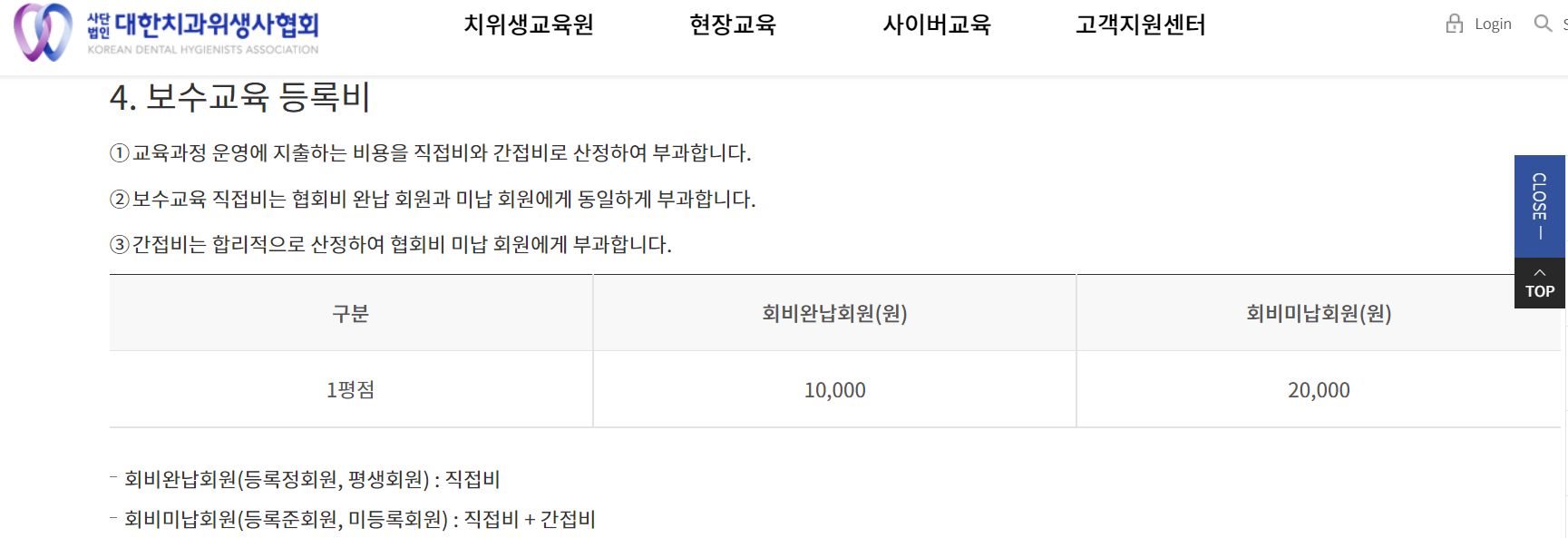대한치과위생사협회 회비 완납회원의 경우 1평점 교육비 10,000원
