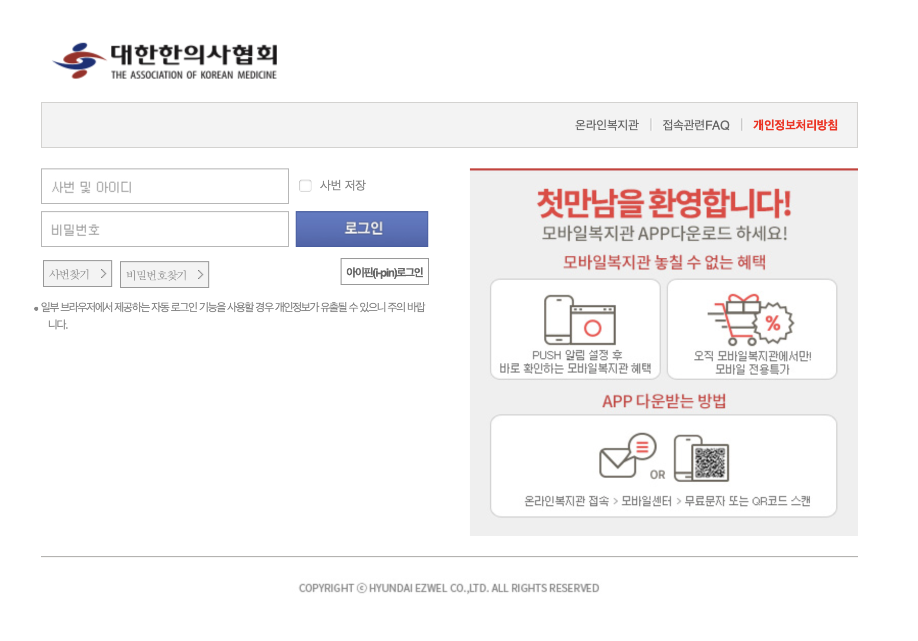 대한한의사협회 복지몰 회원가입 방식이 변경되어 안대드립니다. 복지몰 신규 회원가입을 원하시는 분은 하단의 대한 한의사협회 본회 담당자에게 연락하시어 본회 회원인증 및 복지몰 가입요청을 하시기 바랍니다.