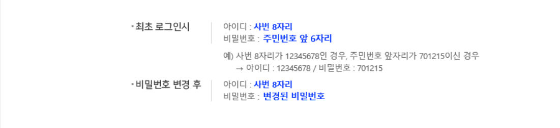 예) 사번 8자리가 12345678인 경우, 주민번호 앞자리가 701215이신 경우