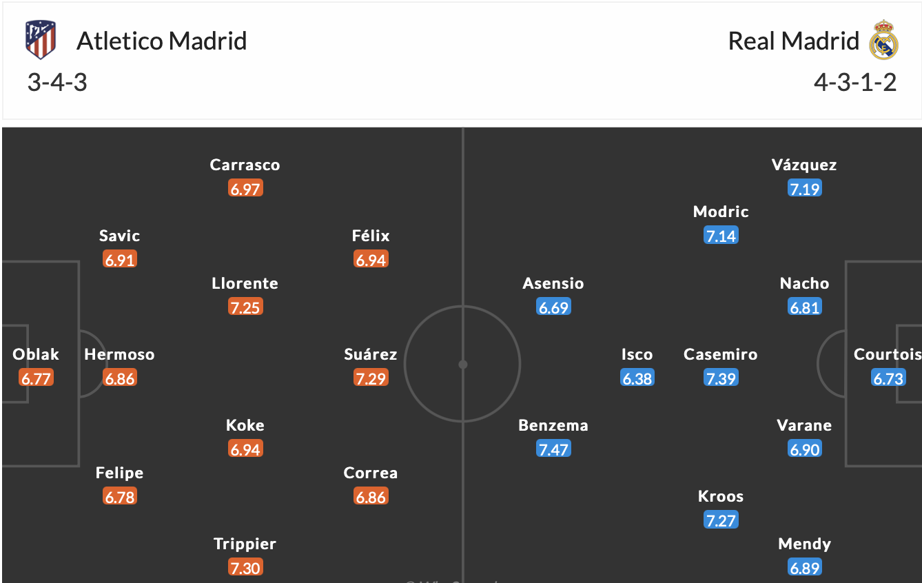 쿠르투아, 바스케스, 나초, 바란, 멘디, 모드리치, 칸세미루, 크로스, 이스코, 아센시오, 벤제마 라인업으로 베스트라인업을 구성할 것으로 생각됩니다.