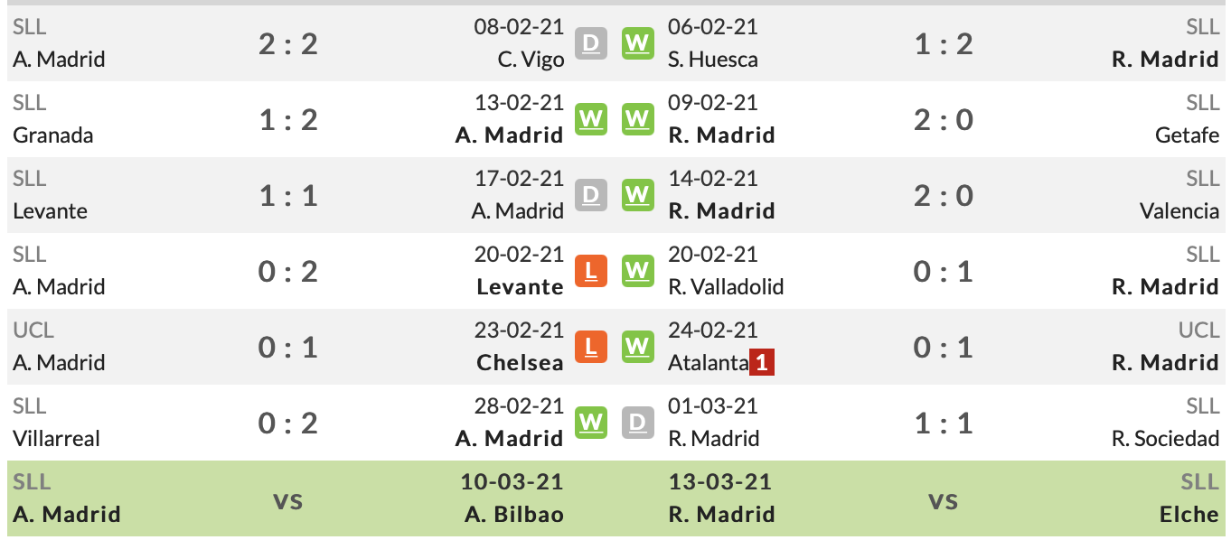 최근 양팀의 더비는 레알마드리드가 압도적으로 좋은 모습을 보이고 있습니다. 특히 최근 10경기 레알은 아틀레티코에게 단 1패만 허용하고 있을 정도로 좋은 모습입니다.