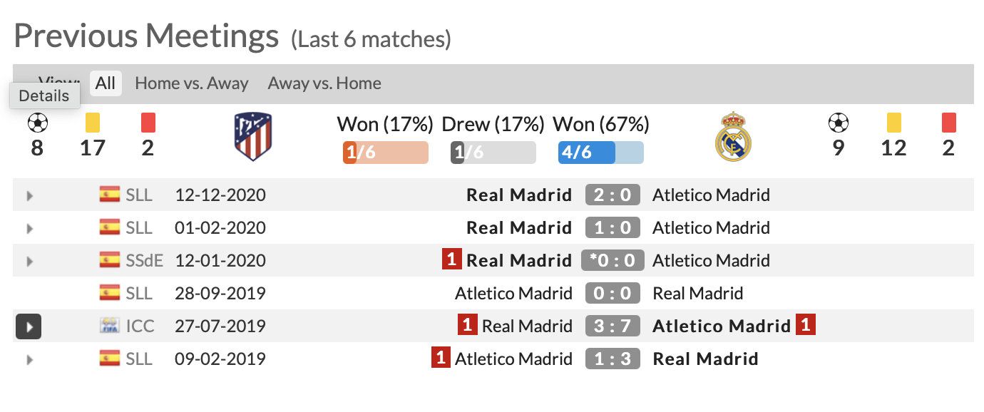 최근 6경기로 줄여보면 레알은 무려 4승 1무 1패이고 최근 3경기는 모두 승리를 따내고 있습니다. 올 시즌 첫 맞대결에서도 레알이 홈에서 2-0 승리를 거두기도 했습니다.