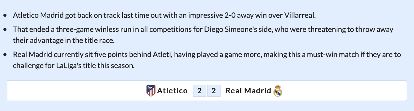 그럼에도 현재 리그 선두 아틀레티코 마드리드가 홈에서 치러지는 마드리드 더비에서 베스트 전력으로 레알을 상대하는 만큼 최소 무승부 이상의 결과를 만들어 낼 수 있을 것으로 생각됩니다.