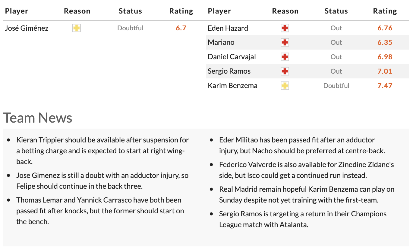 아틀레티코는 호세 히메네스가 부상으로 결장하고 그외 별다른 부상 이슈가 없어 좋은 전력을 유지하고 있습니다. 반면 레알은 아자르, 카르바할, 라모스가 부상으로 결장하지 못하는 상황이 이어지고 있습니다.