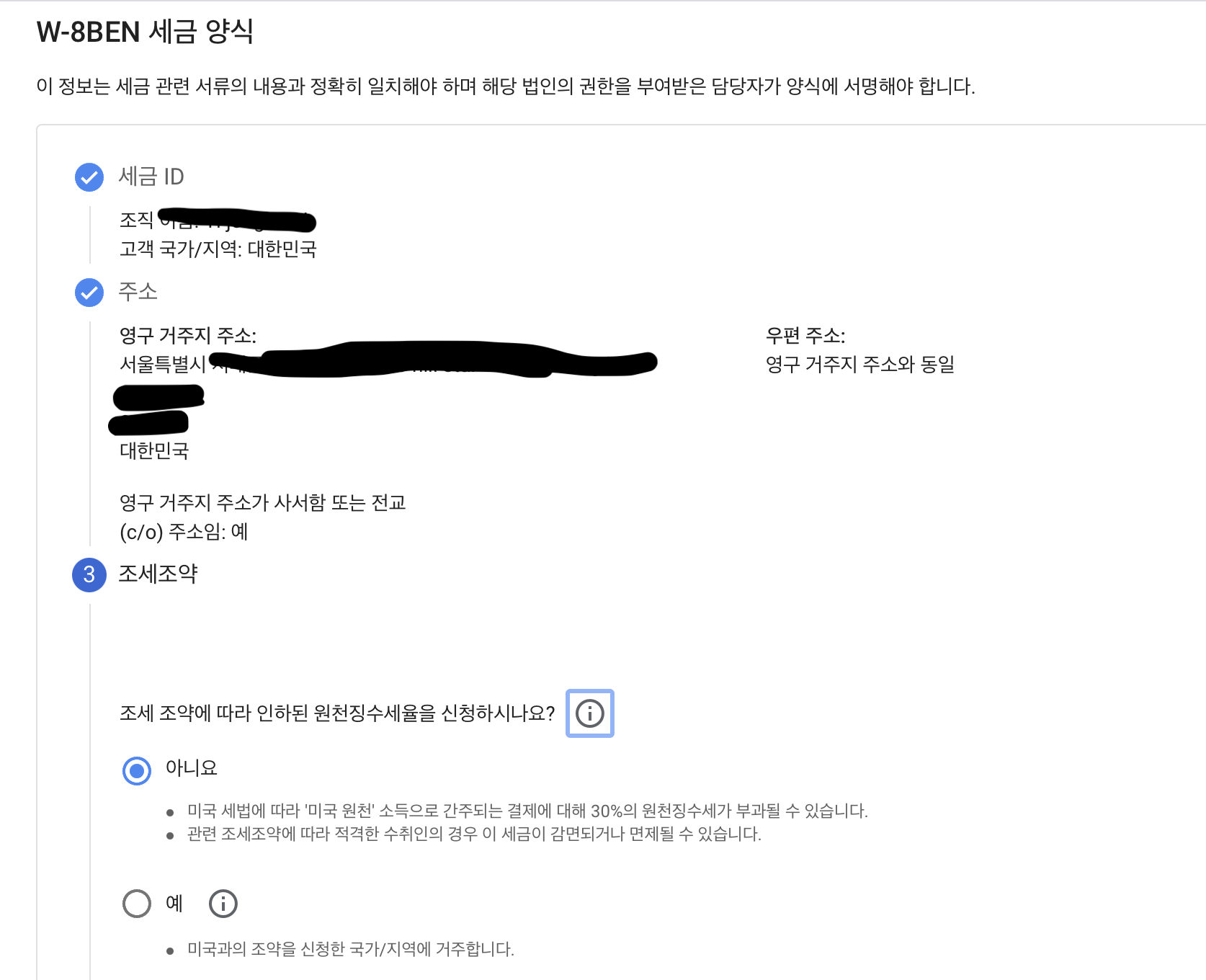 사업자등록을 낸 한국 애드센스 계정이 이 조세조약으로 세금이 감면 면제 되는 것이다. 세무사들이 상담하라고 하는 내용도 이 내용일 것이다. 미국이 원천징수를 하고 또 한국에서 종합소득세를 하고 하면 이중과세의 문제가 발생한다. 개인은 아무런 상관이 없으니 아니요를 눌러서 다음으로 넘어간다. 괜히 30% 세금이라는 문구가 있으니 선택하기 힘들어 하는 분들도 있는데 걱정할게 없다.