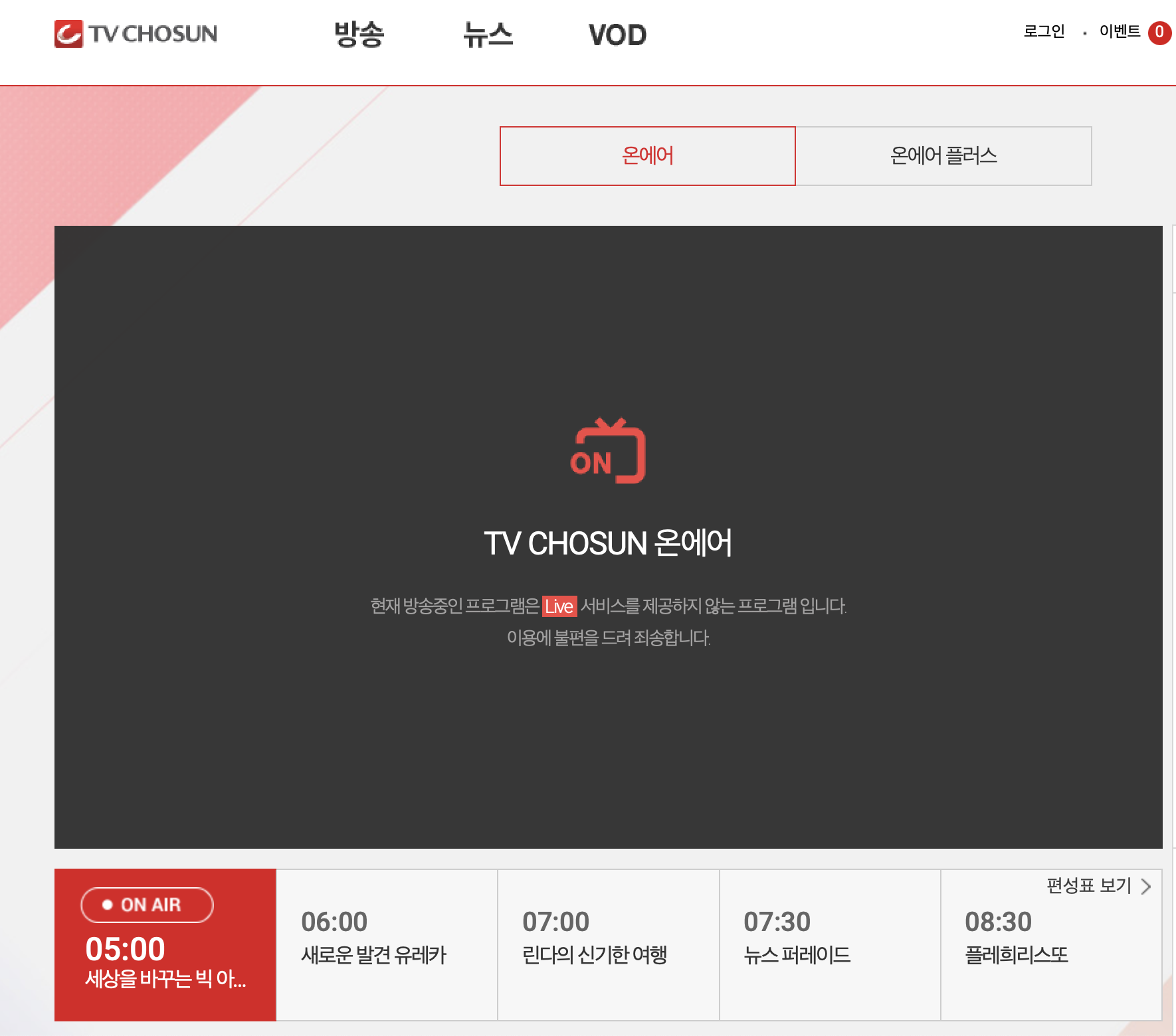 온에어 시청은 별도 로그인 없이 이용하실 수 있고, 고화질 시청을 원하시면 티비조선 온에어 회원가입 후 로그인 하시면 됩니다.