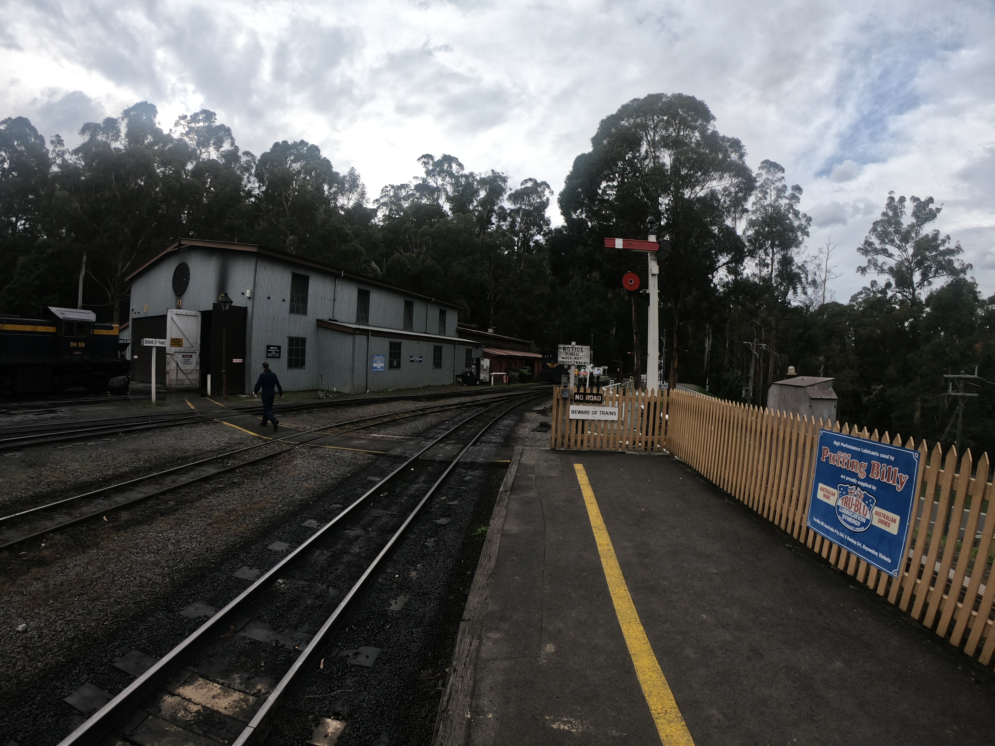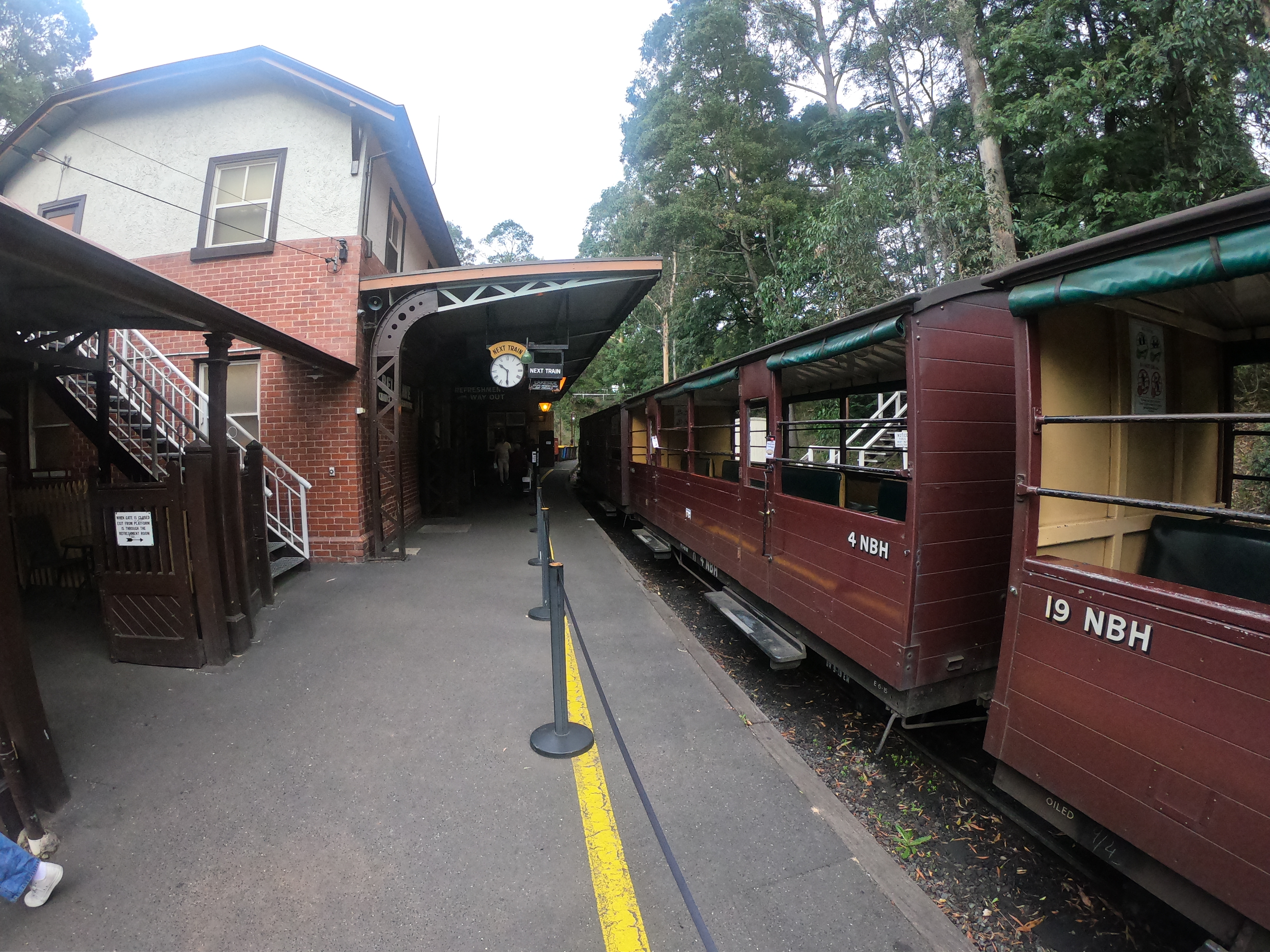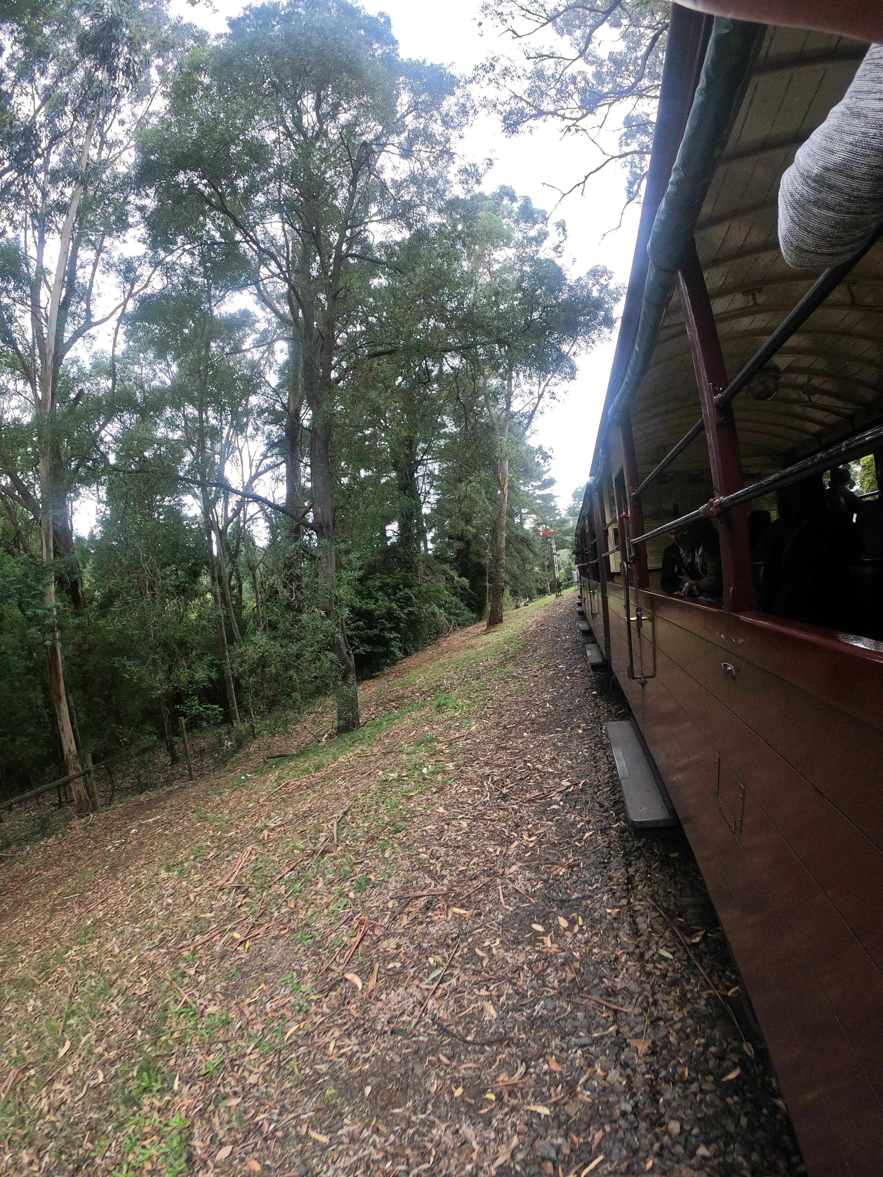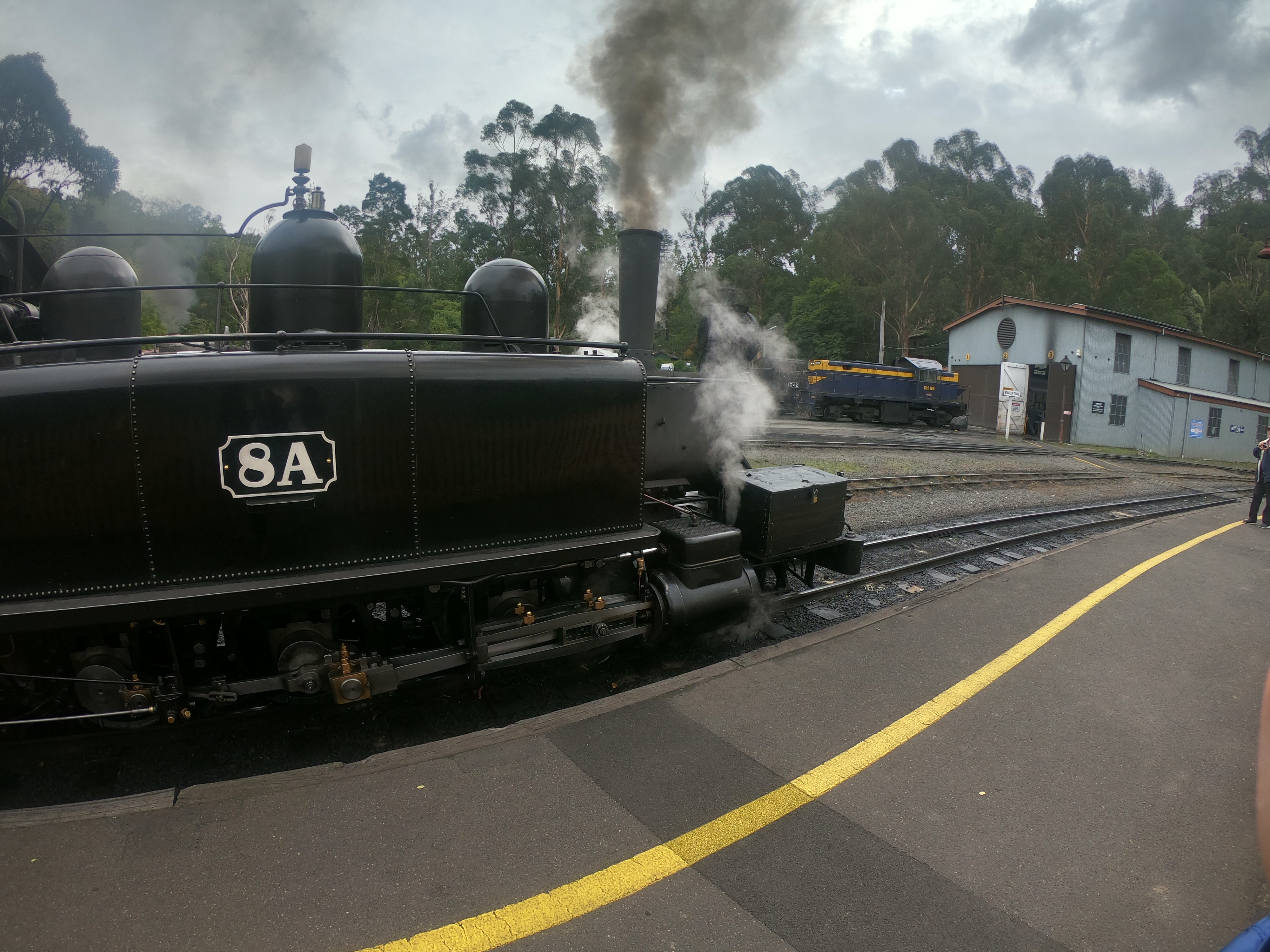 퍼핑빌리에서 석탄열차를 타기 위해 기다리는 시간이다. 진짜 석탄으로 가는 열찬데, 저 검은 연기며 달리는 와중에는 석탄 부스러기도 날아오기도 한다. 그래도 이게 투어의 첫 코스이니 기쁜 마음으로 즐겁게 사진도 찍고 달리는 열차 밖으로 보이는 별것도 없는 풍경에도 즐거워한다. 원래 이 퍼핑빌리의 매력은 차창으로 다리를 내밀고 앉아서 가는 것이라고 생각하는데 위험성과 안전의 문제로 금지가 되었다. 얼굴을 내밀고 사진은 찍을 수 있다.
