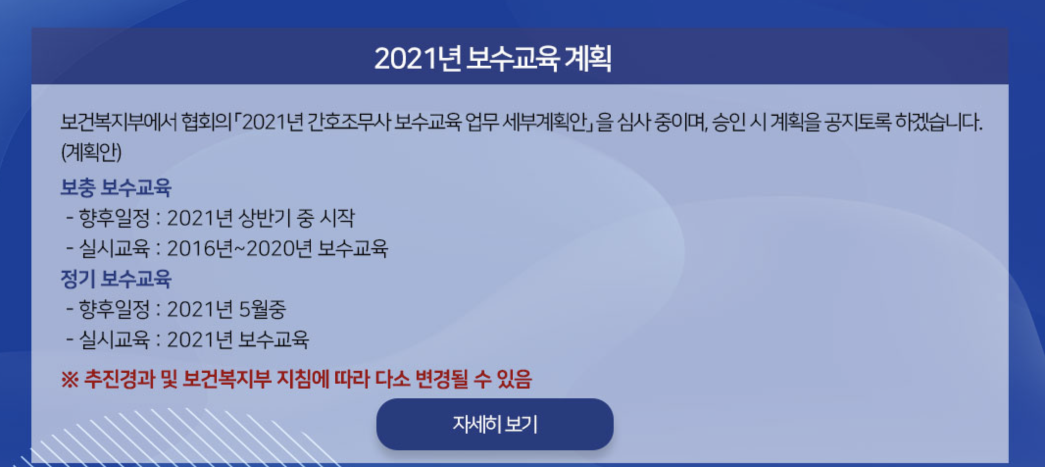 2021년 간호조무사 보수교육은 상반기 5월 중 시작될 예정입니다.