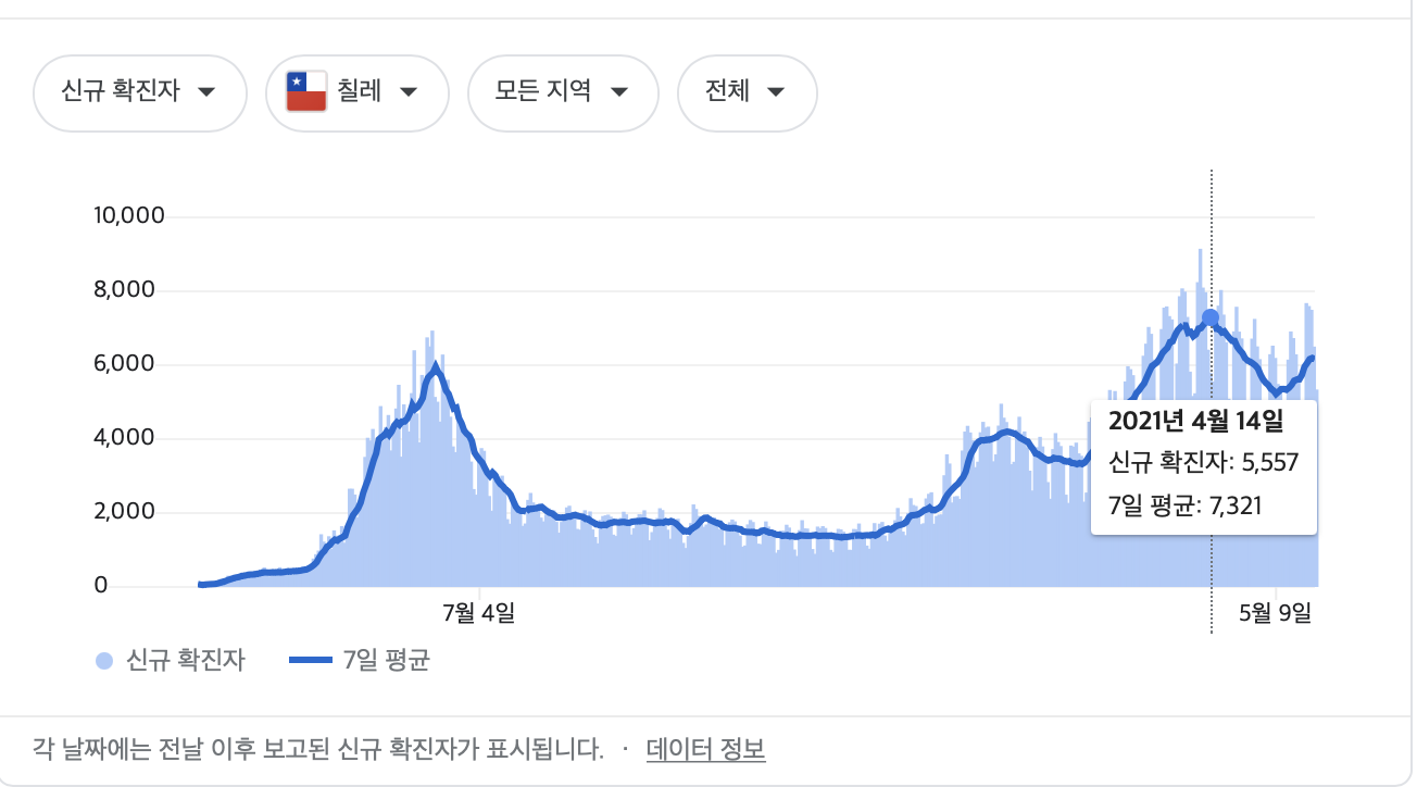 칠레를 비롯 남미 국가는 가장 늦은 2020년 3월달이 되어서야 코로나 바이러스가 크게 유행했음에도 대비를 전혀 하지 못하면서 그대로 코로나가 창궐해 지금까지도 가장 많은 확진자와 사망자를 내면서 안그래도 열악한 경제활동인구들이 직격탄을 맞고 있다. 다른 나라 사정까지 일일이 열거하기는 보는이도 괴롭고 나도 했던말 어디서 본거 같은 이야기를 그대로 재생산 하기도 지칠정도로 매일 뉴스에서 나오는 소식이 거의 똑같고 지겨울 정도로 반복적이다. 암튼 지금 칠레는 중국 시노백 백신으로 2000만 인구중 50%인 1000만명이 넘게 1차 접종을 완료했다. 언론에서도 매일 이런 백신 접종현황과 더불어 일일 신규 확진자를 발표하는데 백신 접종이 시작되고 사실상 조금만 더 지나면 집단 면역에 도달 해야 할 것으로 보이는 칠레는 확진자가 더 늘어나고 있다.
