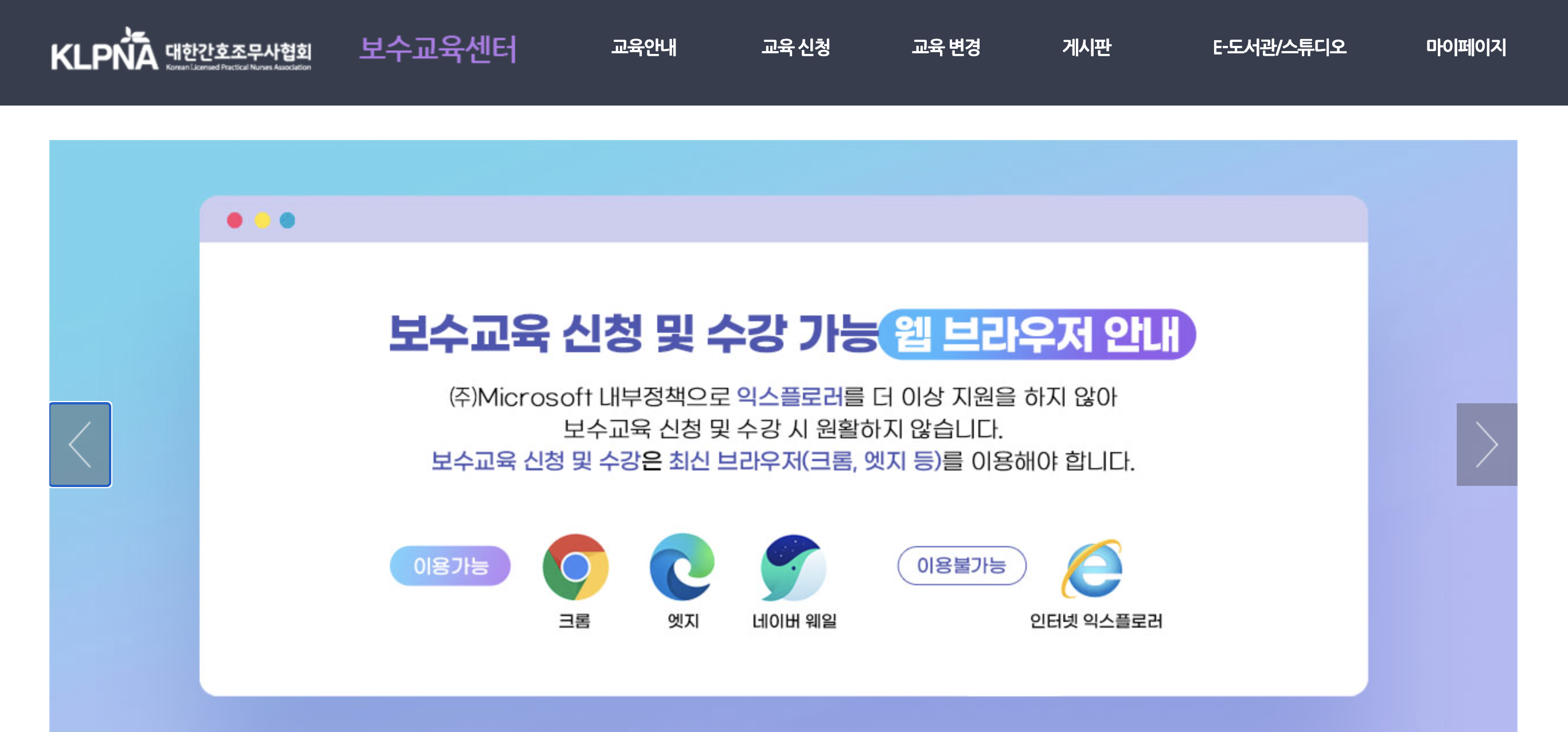 간호조무사 보수교육은 인터넷 익스플로러에서는 지원되지 않습니다.
