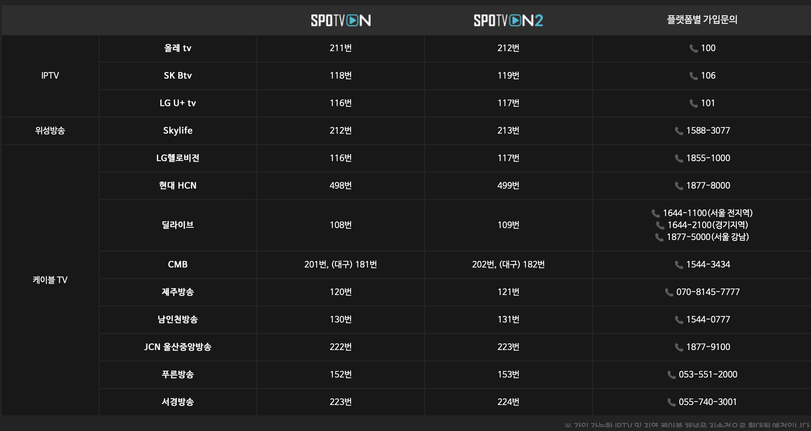 스포티비온은 올레티비의 경우 211번 / sk Btv 118번 / LG U+ tv 116번 / 스카이라이프 212번 / LG헬로비전 116번 / 현대 HCN 498번 / 딜라이브 108번 입니다.