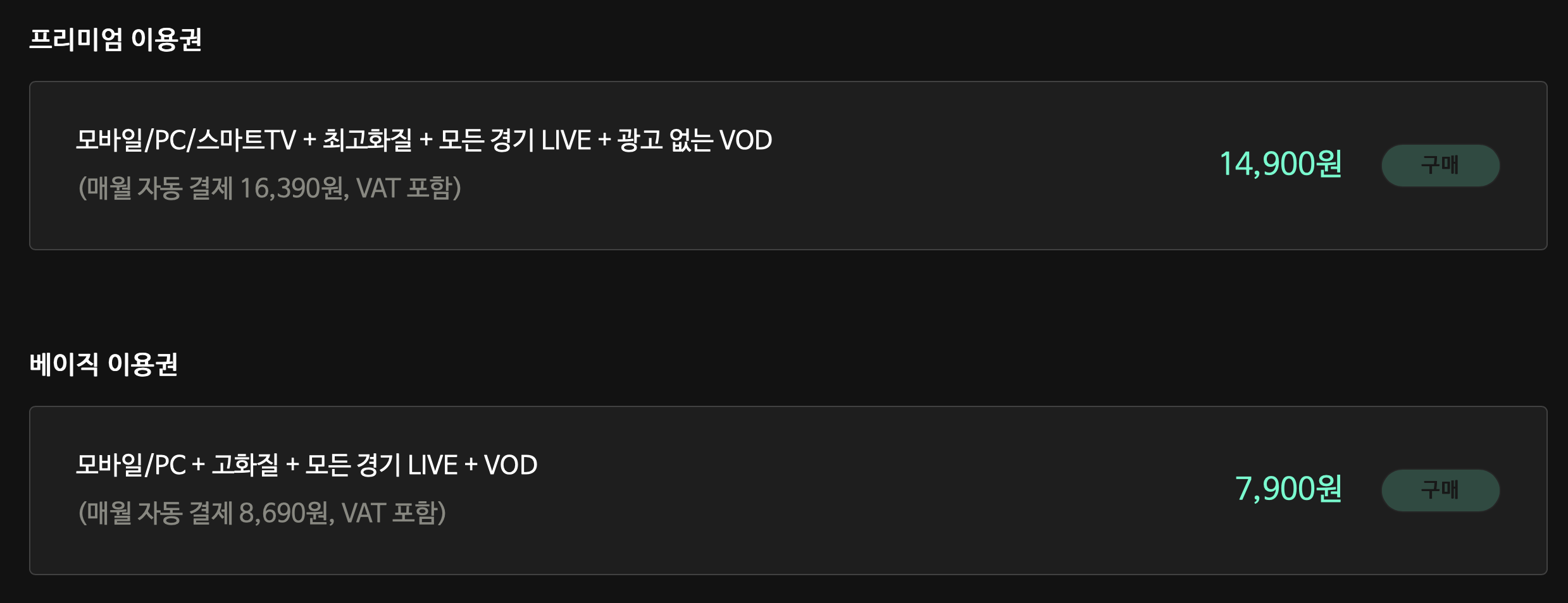 프리미엄이용권으로 모바일 및 PC 스마트TV 기기에서 모두 이용할 수 있는 경우 16,390원 / 모바일과 PC에서만 시청하실 분들은 8,690원으로 스포티비나우를 이용하실 수 있습니다.